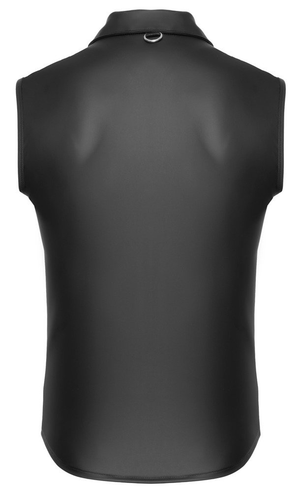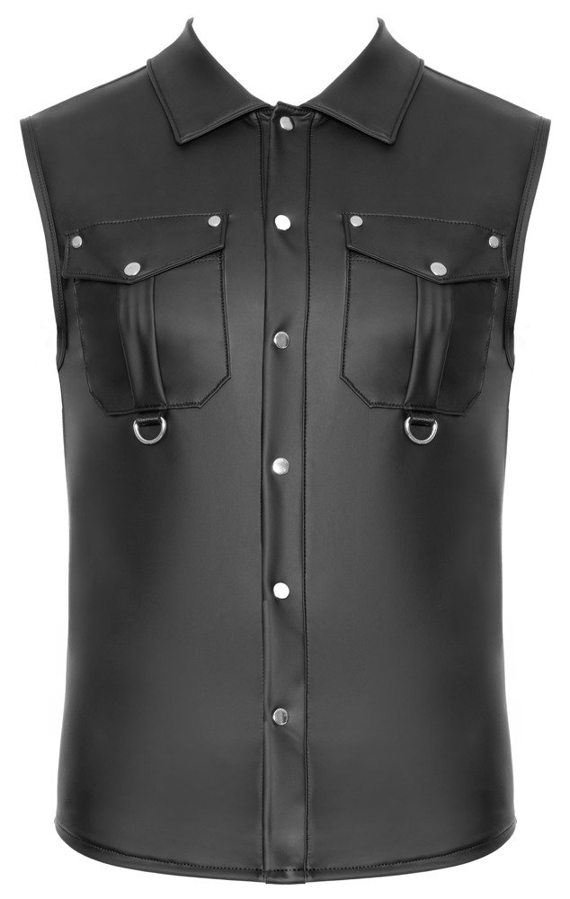 Een mouwloos shirt van NEK, nauwsluitend en gemaakt van glanzend materiaal. Dit trendy shirt is voorzien van opgestikte borstzakken met D-ringen. De voorkant is voorzien van een drukknoopsluiting en D ringen aan de zoom. Met deze extra trendy touch steel jij overal de show!