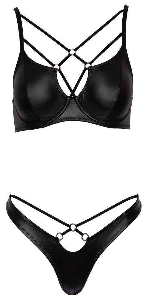 Zet jezelf in de spotlights met dit verleidelijke zwarte wetlook setje! De beugelbeha biedt optimale ondersteuning en comfort, terwijl de decoratieve ringen en bandjes in je decolleté echte eyecatchers zijn. Met de verstelbare bandjes en haaksluiting kun je de beha perfect op maat maken. Ook de rio string scoort punten met zijn ringen en bandjes aan de voorkant. Dankzij de hoge beenuitsparingen lijken je benen eindeloos lang. Voel je geweldig – en sexy – in deze wetlook set.