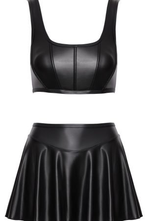 Deze luxe rok & jasje set combineert wetlook, kant en strass voor een gedurfde en luxe uitstraling. Perfect voor wie exclusiviteit wil uitstralen.