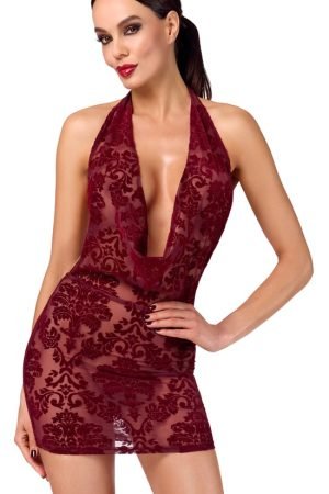 Bordeauxrode transparante mini jurk met halternek, off-shoulder design en extra diepe halslijn voor een spannende nacht!