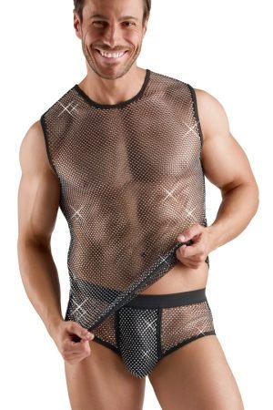 Transparant mouwloos mesh shirt van Svenjoyment met fonkelende strassteentjes. Licht, elastisch en onweerstaanbaar op de dansvloer.